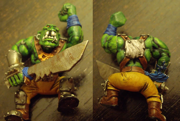 Now orks really don't like having this stuff stolen - I thought I'd help them out by painting on some suitably orky faces so no one could possibly get confused about who it belonged too. Regal blue base with enchanted blue on top. 2:1 paint to water.